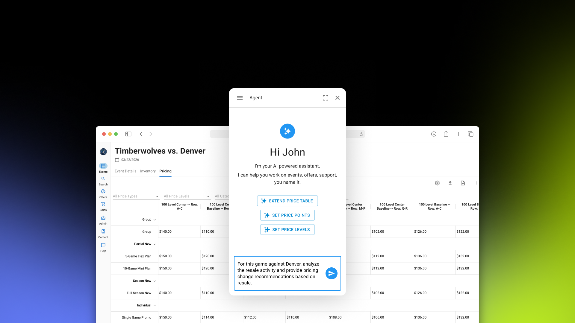 Pricing Manager – An agent that enables ticket operations teams to model scenarios and execute pricing changes within an event and across multiple events simultaneously in minutes instead of hours